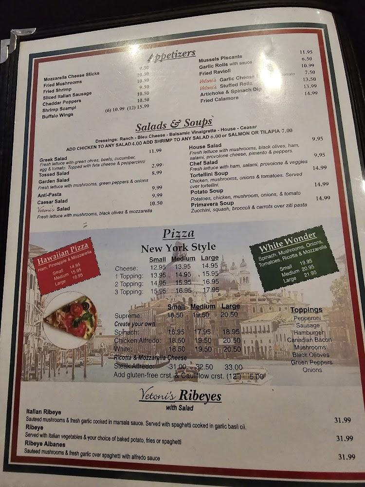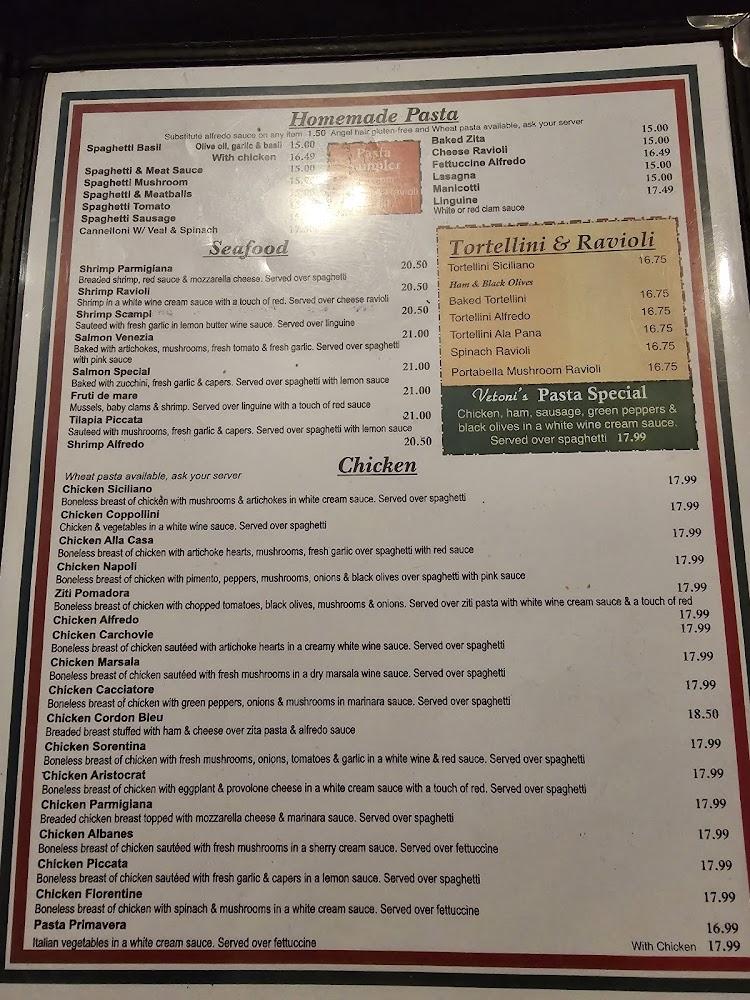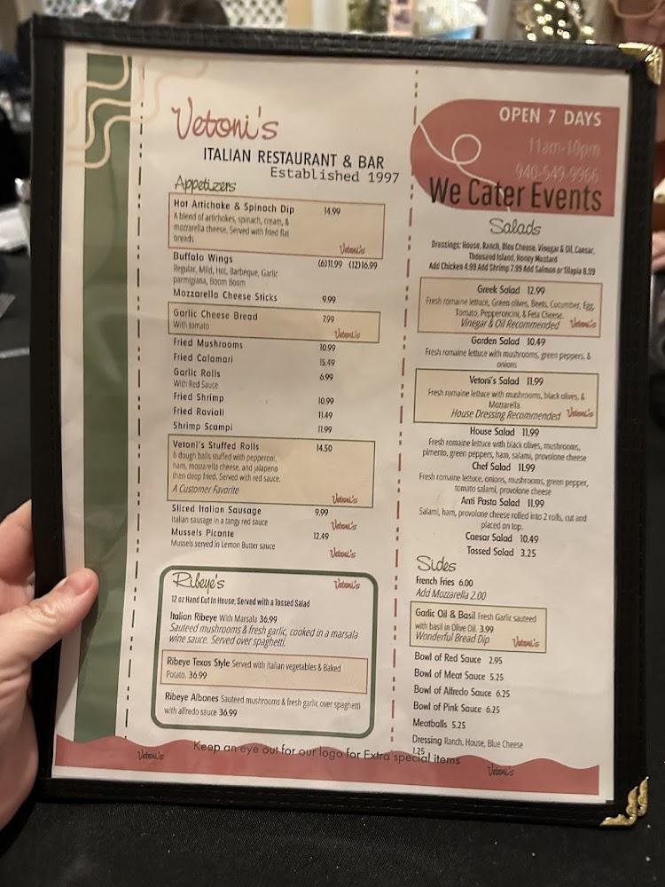Welcome to Vetoni's Italian Restaurant, your local haven for authentic Italian cuisine in Graham, Texas. Located at 1111 TX-16, we offer a delightful menu featuring traditional dishes, excellent cocktails, and an extensive selection of beers and wines. Whether you’re dining in, taking out, or enjoying our speedy delivery service, our friendly staff is dedicated to providing a memorable experience. With a relaxed and romantic ambiance, Vetoni's is perfect for lunch, dinner, or a solo meal. Enjoy vegetarian options, shareable plates, and tempting desserts—all within a welcoming space accessible to everyone. Join us and taste the passion of Italy!
